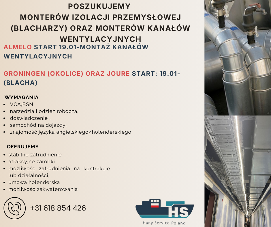 Posiadasz doświadczenie w branży izolacji przemysłowej lub montażu kanałów wentylacyjnych oraz planujesz wyjazd po nowym roku? Jeśli tak to zapraszamy do kontaktu telefonicznego, chętnie opowi...