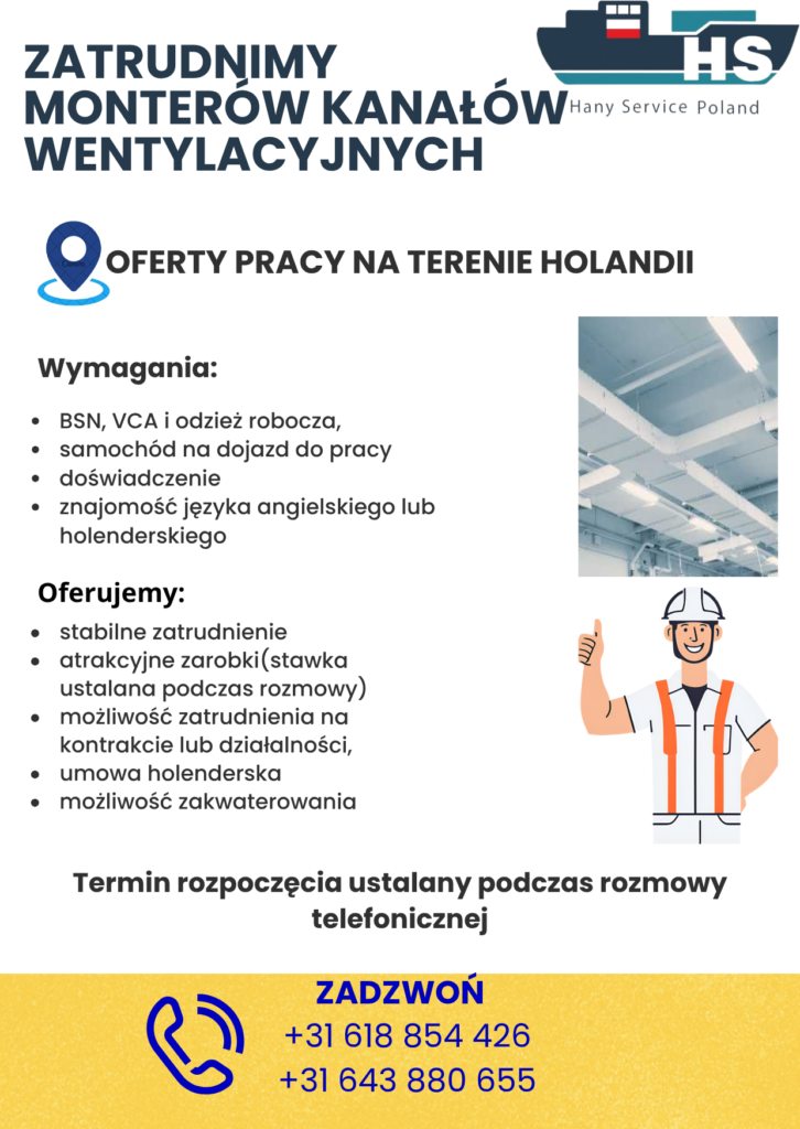 Zatrudnimy monterów kanałów wentylacyjnych do pracy w Holandii: atrakcyjne warunki, stabilne zatrudnienie i możliwość zakwaterowania.